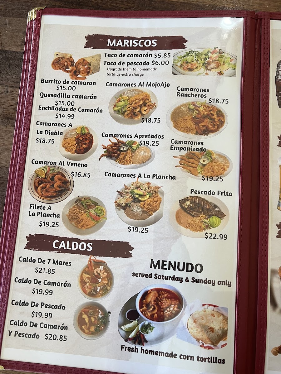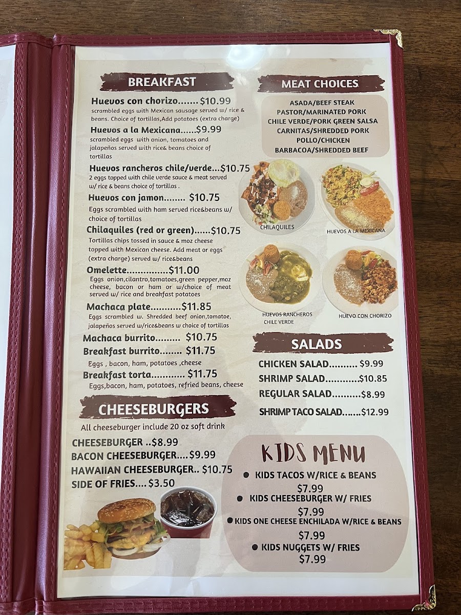 Start your day with classic breakfast options like chilaquiles rojos, breakfast burritos, or an omelette filled with fresh ingredients. For lunch or dinner, the menu highlights include flavorful street tacos, green enchiladas, and a variety of seafood specials such as pescado frito and shrimp tacos. Snacks and starters like chips with salsa set the pace for a leisurely meal.