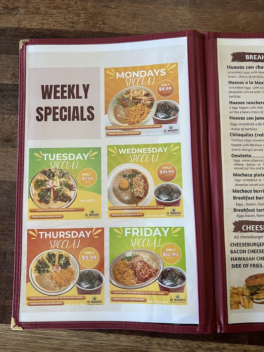 El Maguey Mexican Restaurant offers a straightforward yet inviting menu that reflects the casual, community-focused spirit of Porterville dining. The menu features comforting, traditional Mexican fare that fits well with a relaxed meal any time of day, whether you’re stopping by for a hearty breakfast or enjoying seafood tacos in the evening.